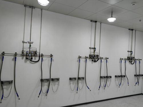 8.氣瓶間內的實驗室氣體瓶與氣壓調控器互相應用SS316L直流低壓復合軟水管連到無滲透法。直流低壓軟水管為柔性板軟水管,以確定連到的便宜性。并自導安全防護網鋼纜,防范毀滅性事情下,瓶閥影響等干涉現象造成的直流低壓“抽鞭”問題。氣壓調控器與管路的連到方案為雙環卡套。